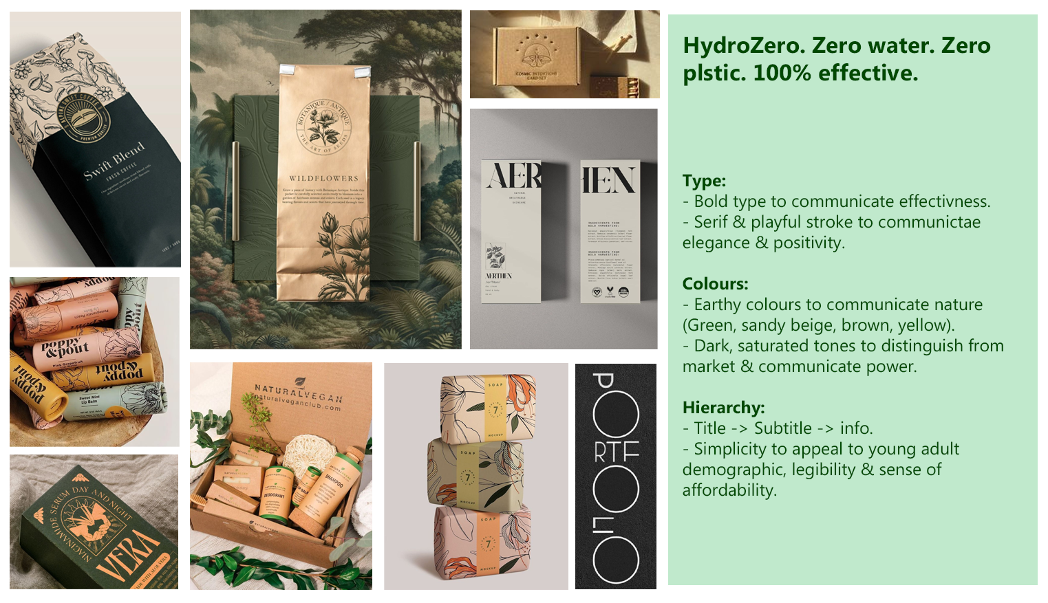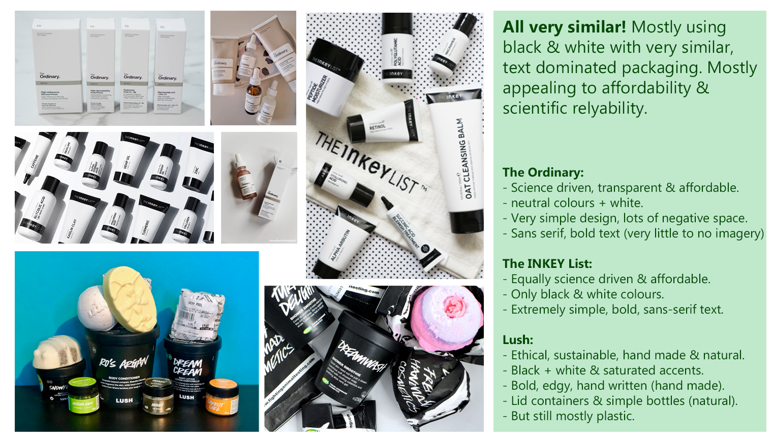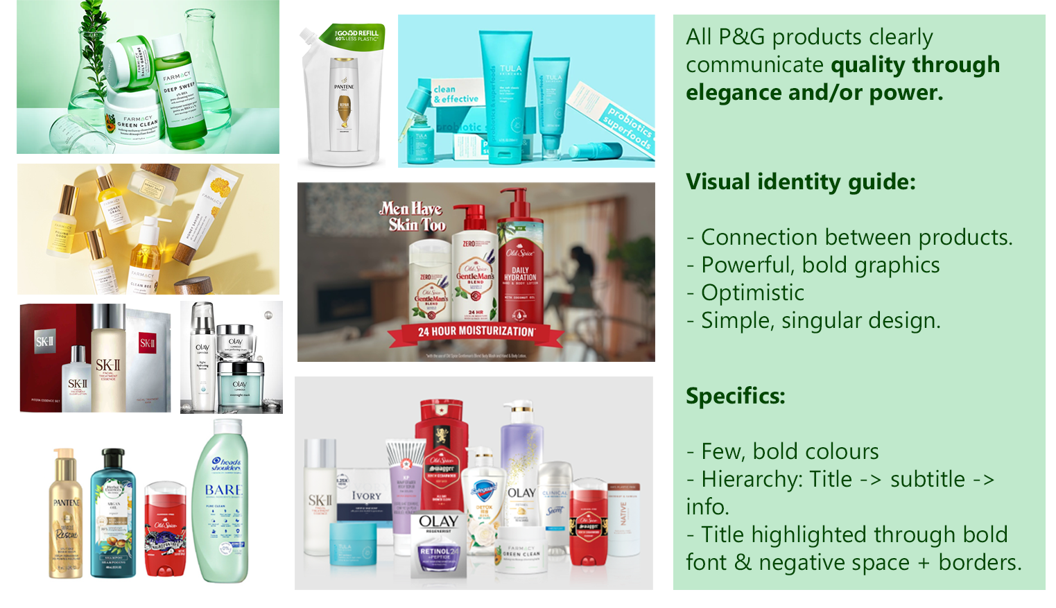 Choosing to produce a P&G skin care product for young adults (ages 18 - 25) in the UK who are interested in sustainability, I began by conducting research on P&G’s style. In doing so, I assure my product will follow their strong & elegant branding identity. Following this, I conducted competitor research to find a gap in the market. I discovered most brands use a black & white colour scheme with very simplistic, “scientific” designs. Therefore, my product will stand out by using a more stylised design and heavily lean on sustainability.