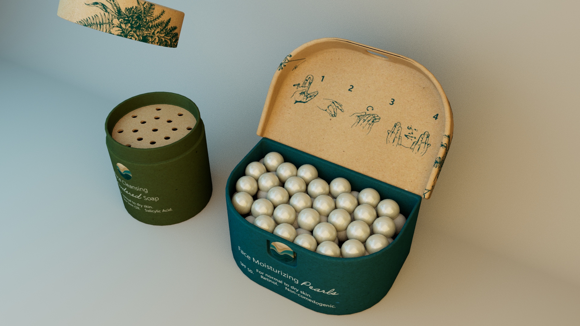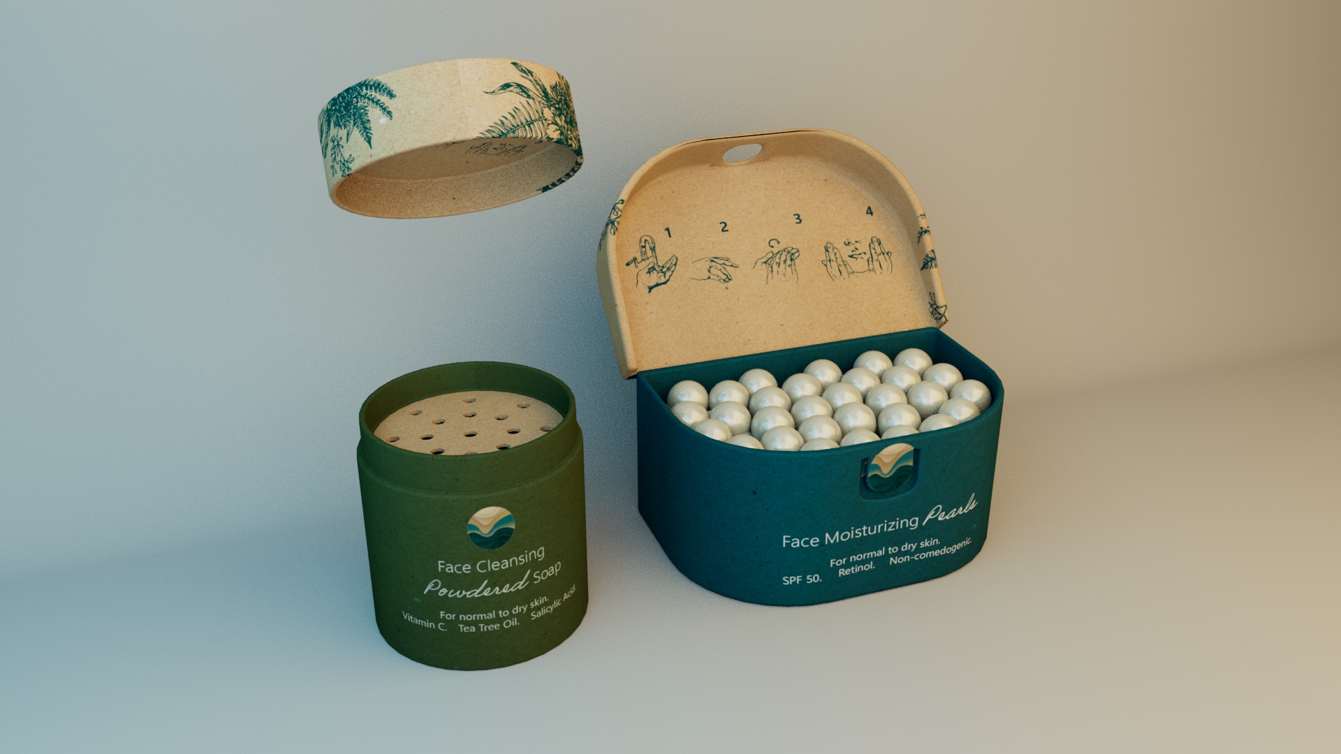Using my moodboard & brand specifications, I created a series of Logos and packaging options using Photoshop & Maya. Always focusing on the themes of effectivness, elegance and clear sustainability. The moisturizer package includes a childlock & wide hand grip, to remove risk of children ingesting the pearls.