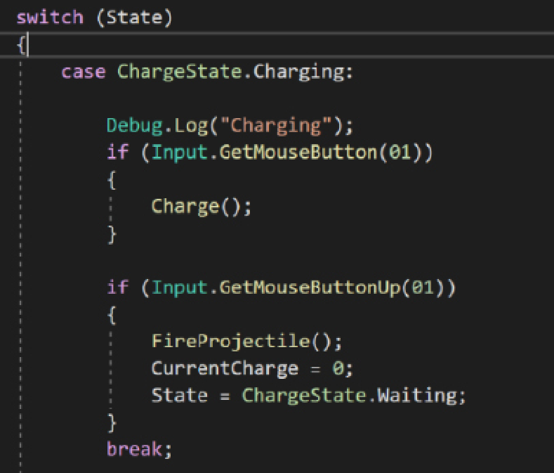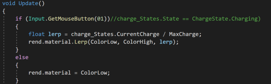 For the charging mechanic, I used a switch statement in C# between waiting, aiming and shooting. This efficient shooting mechanic is easily reusable and cheap. This was also linked to Fireboi’s visuals, by reusing the “CurrentCharge” float as the perfect time variable to lerp fireboi’s glow & non glow materials.