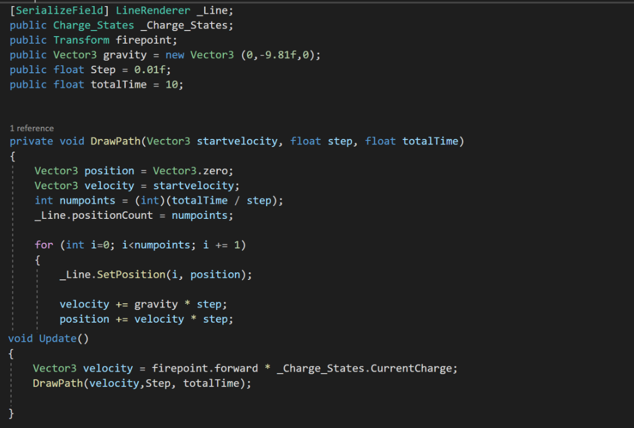 For the script itself, I created a ‘Draw path’ function that contains a loop for each index that updates position & velocity. I also used a variable from my charge state script (explored further on) to make sure the line renderer is pointing in the same direction as the bullet firepoint. The final result is cheap, reusable and accurate.