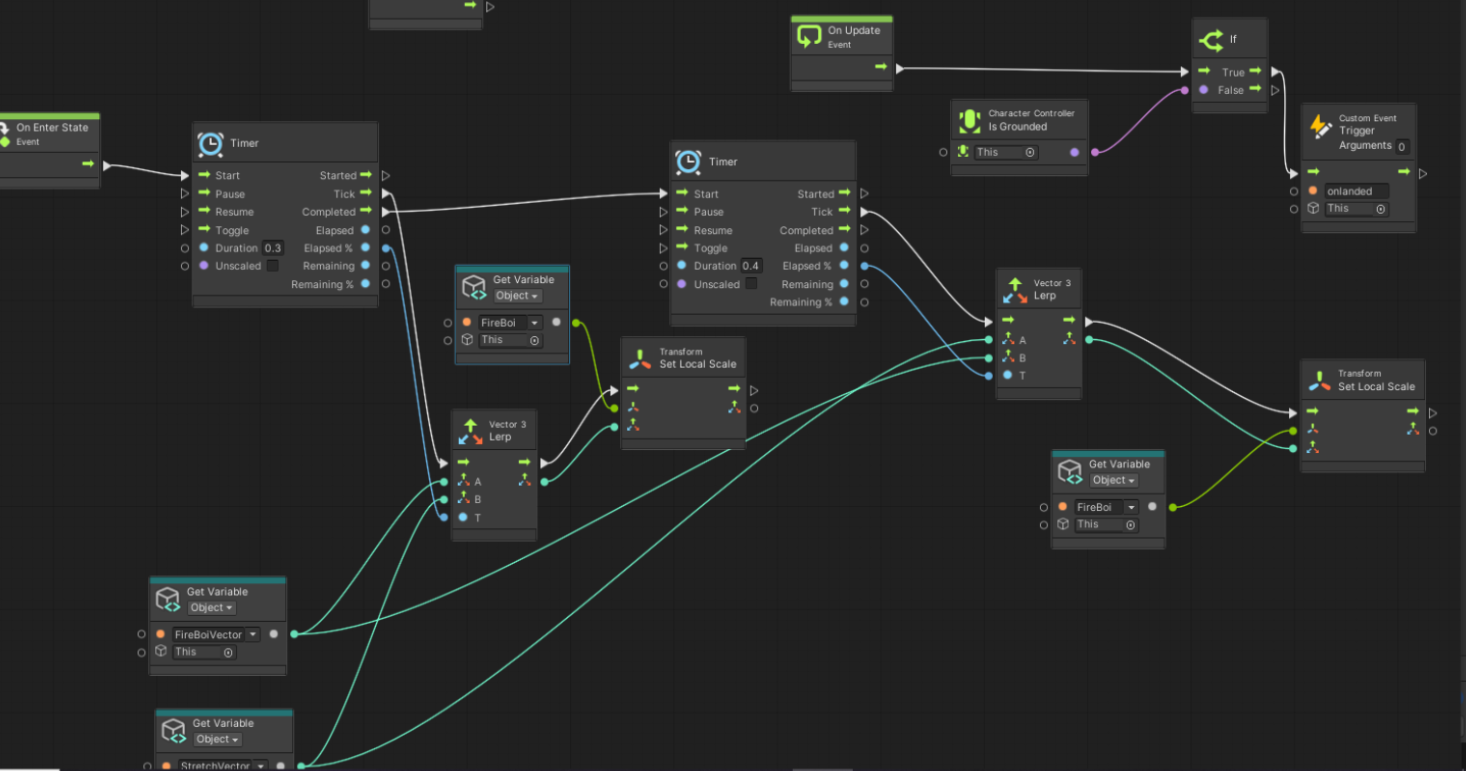 For Fireboi’s squishing & stretching animation, I used a state machine in Unity’s Bolt (Visual scripting) to control Fireboi’s stretching animation by reducing and increasing Fire Boi’s X & Y scale through a lerp function. This script creates a smooth animation that, unlike a rig animation, can be edited directly in the engine.