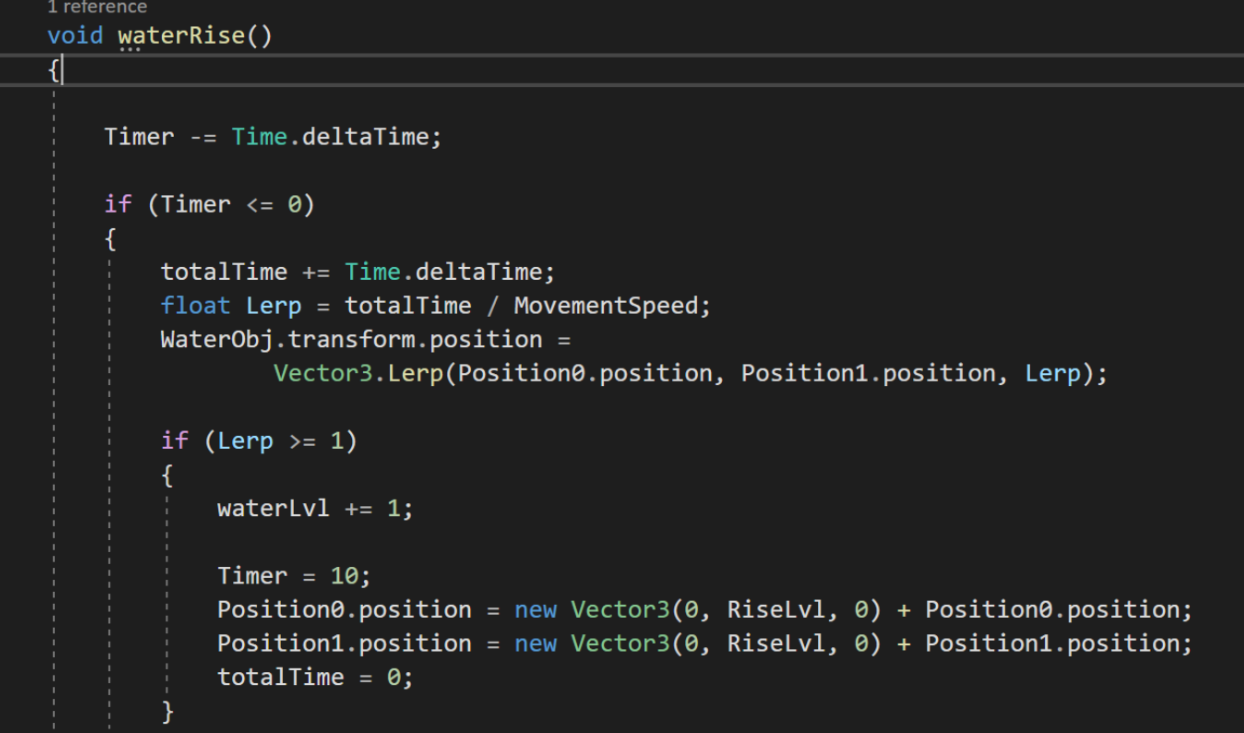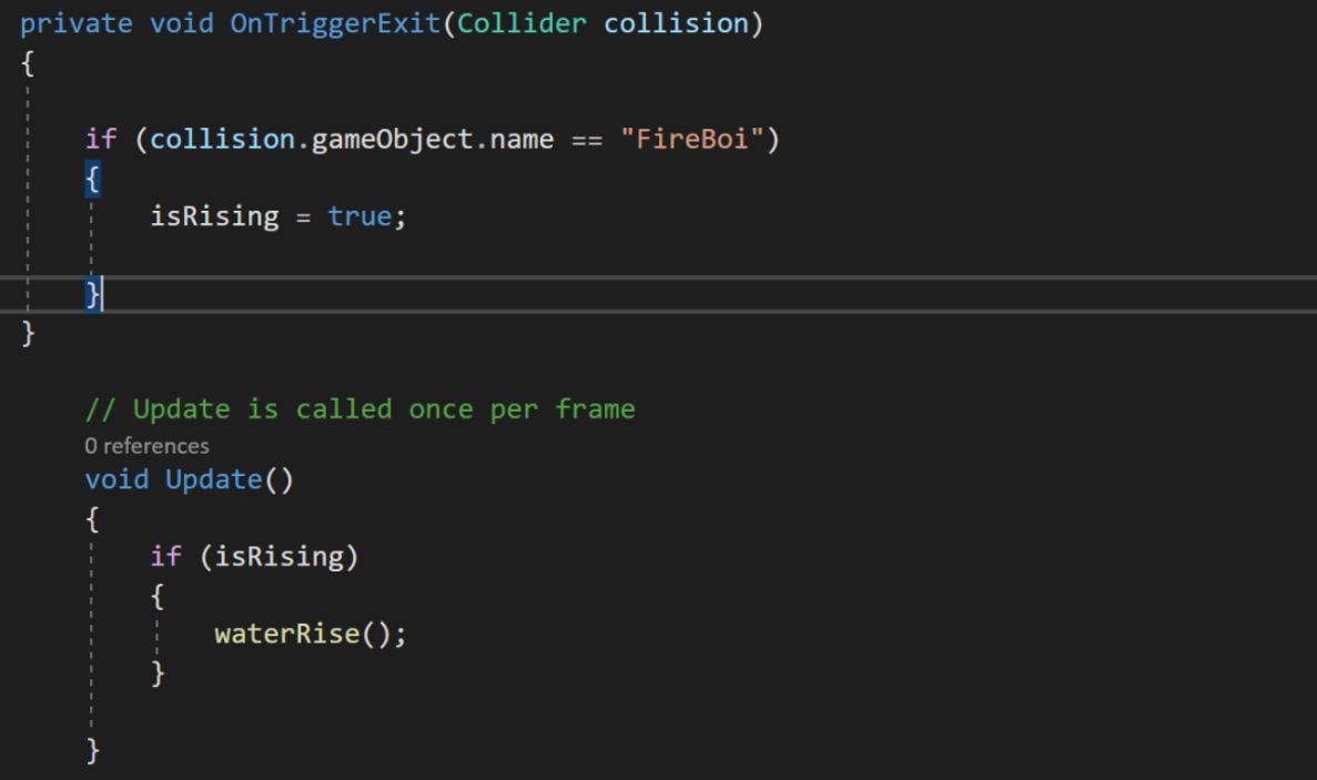 To simulate a flooding lab, I created a boolean variable that would become true when Fireboi leaves the starting trigger box, triggering a lerp function that would raise the water level every 10 seconds.