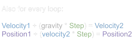 As change in position(distance) is = Velocity x Time, I first needed to calculate velocity, which is Acceleration x time. As ‘Step’ is how much time between each point, this is the variable I would be using (which I made smaller to draw a higher resolution curve). As my only acceleration is gravity and my time between points is ‘Step’ I knew that I would need to add the following equations to my loop for every point index: