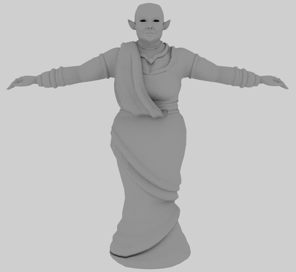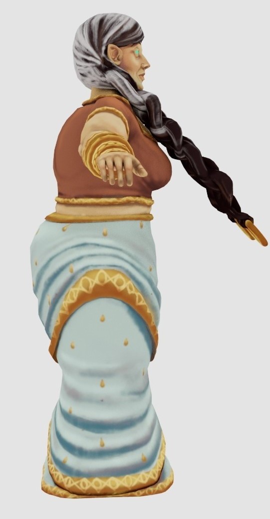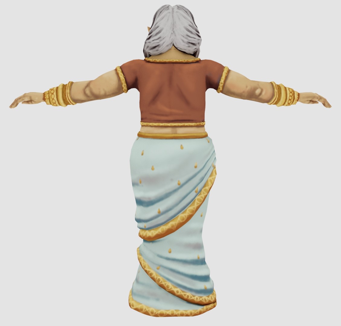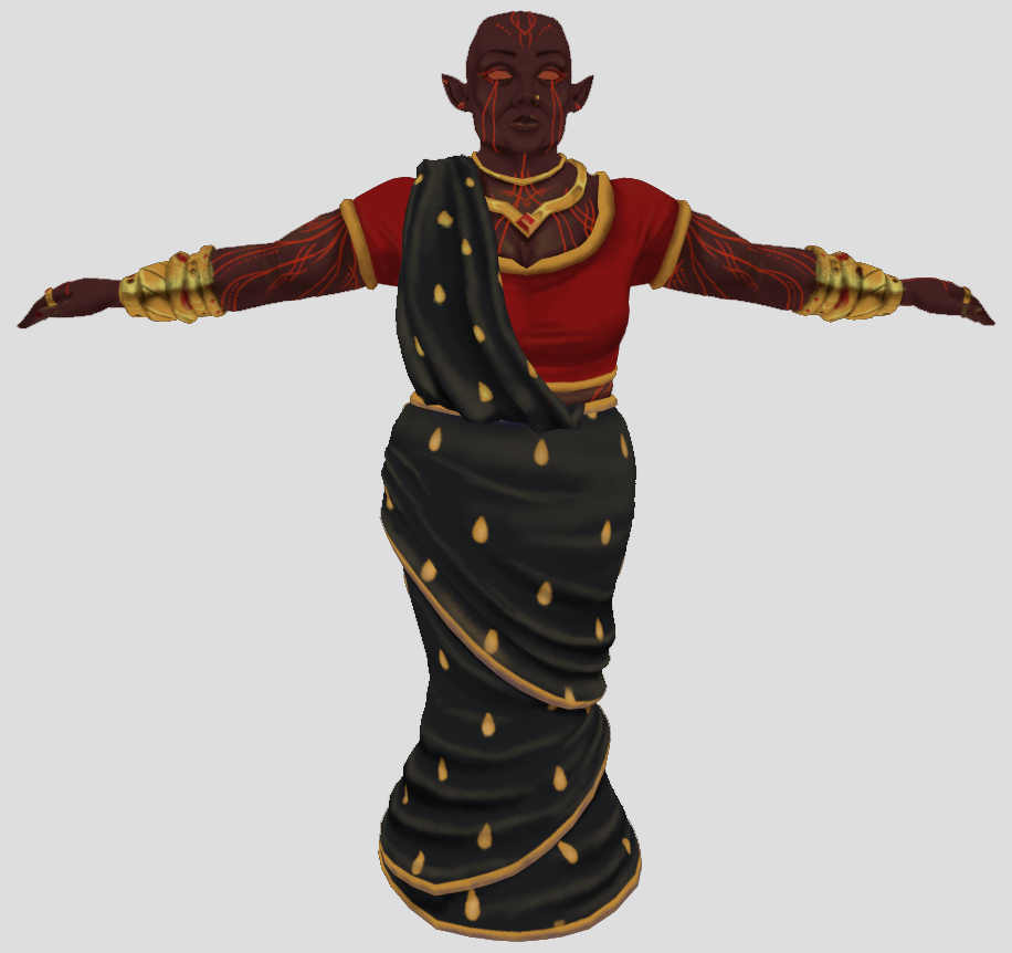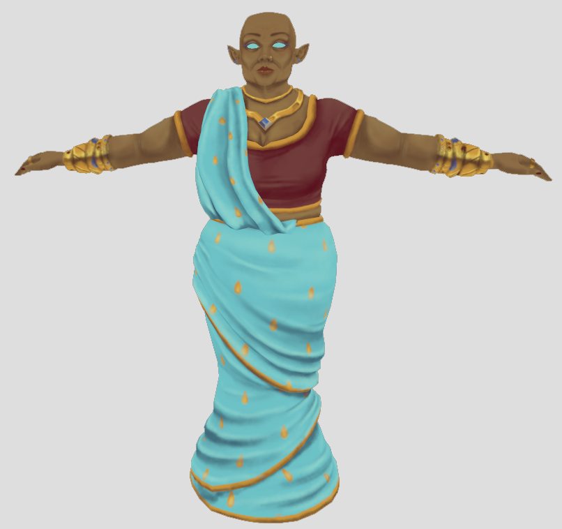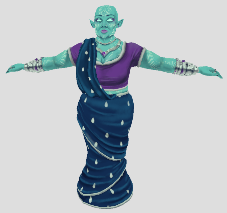 WIP update: Zia’s hair will be added later procedurally. Certain unnecessary segments were removed while, in more flexible areas (such as the shoulders & midriff) they were increased in order to avoid unnatural stretching issues. More details were added, such as the shoulder cloth and necklaces (evidencing her materialistic personality).