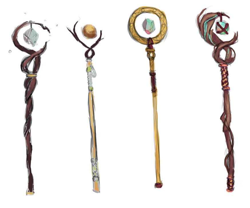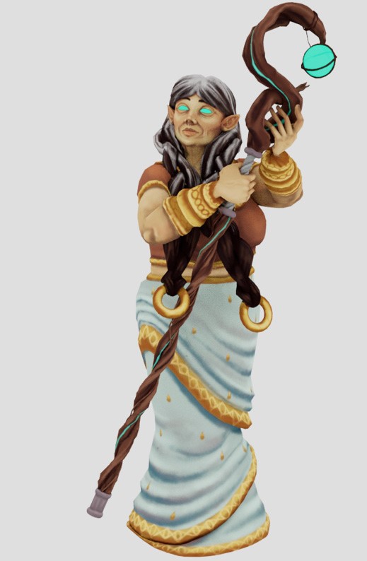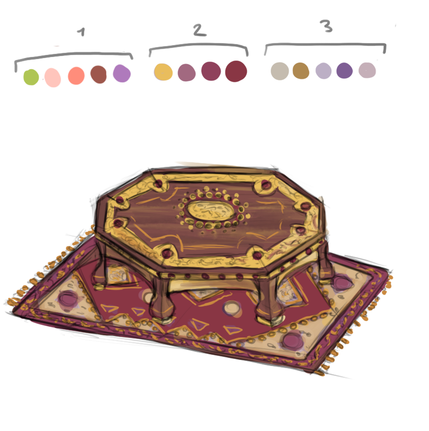 For Zia and her staff, I experimented with a few different iterations before creating the final reference. For the table and carpet, I created 3 different colour pallets that compliment Zia’s character. These are used to retexture the table and carpets, maximising efficiency in terms of re-using objects in a scene while minimising repetition.