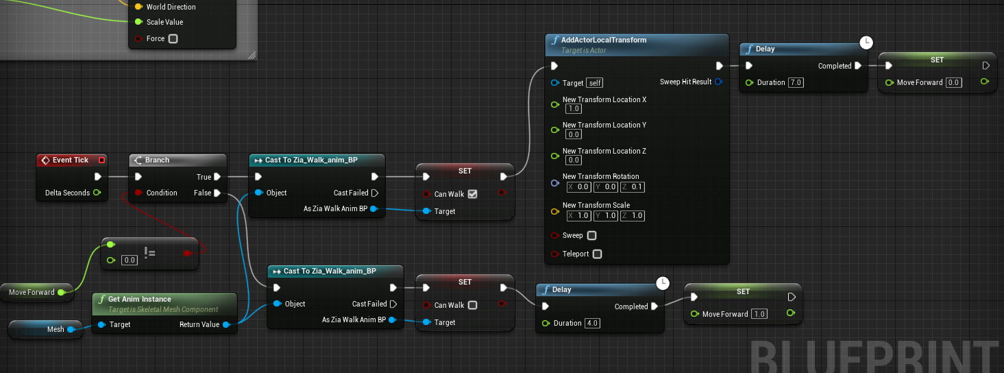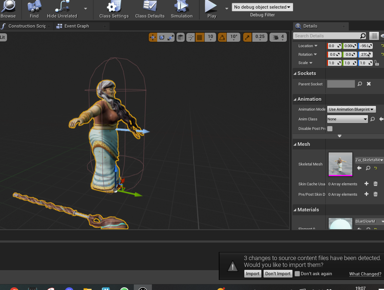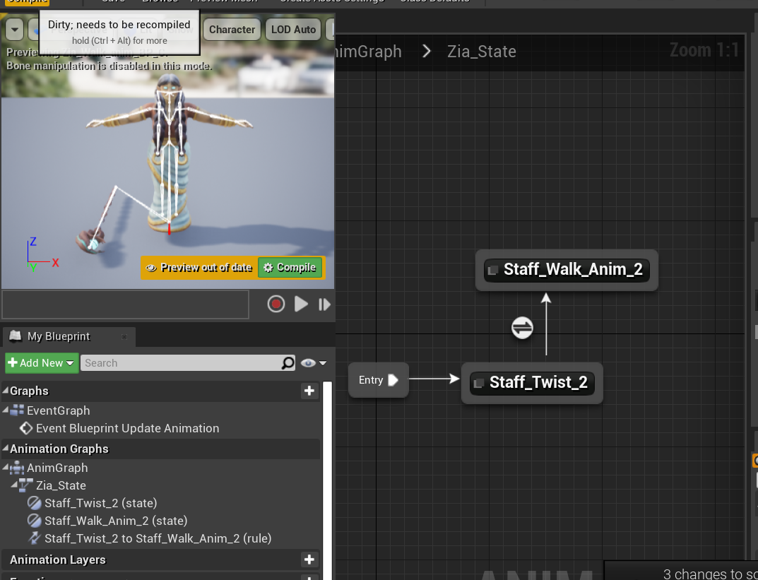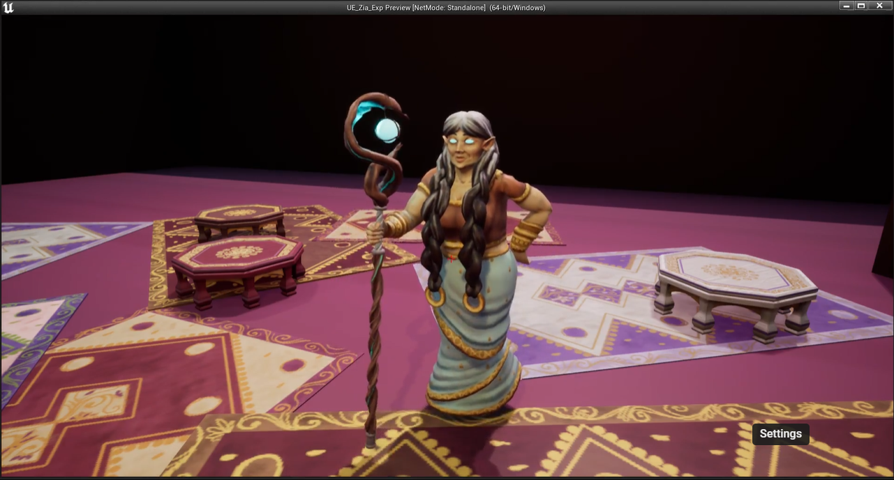 I efficiently exported Zia into Unreal by replacing the included First Person Blueprint with Zia’s skeleton. After importing her textures and my decorational 3D assets, I created a state machine and a blueprint that would allow Zia to autonomously switch between her 2 animations.