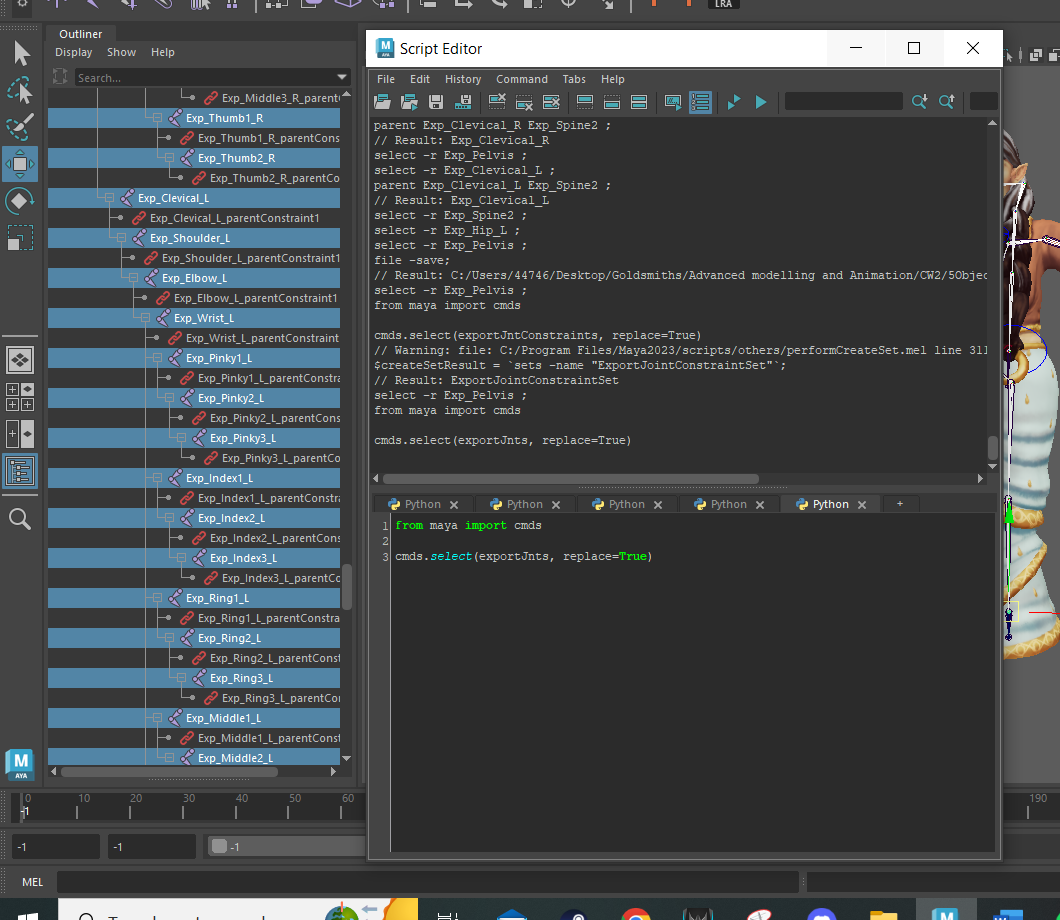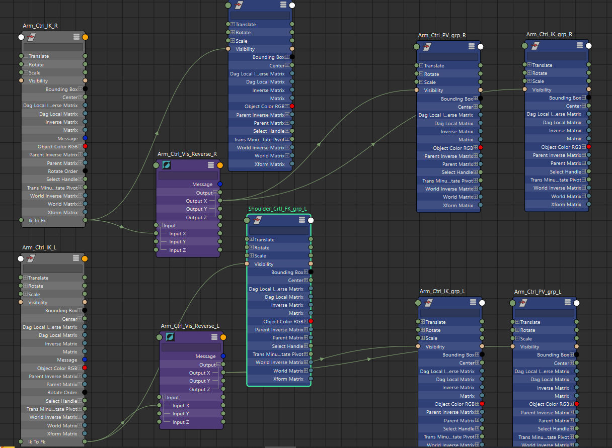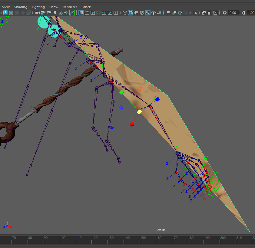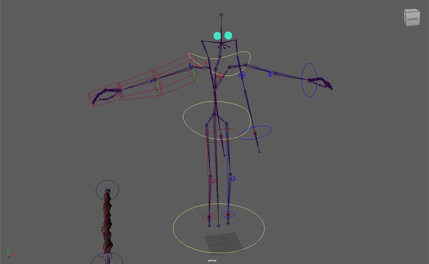 Zia uses advanced rigging methods, such as a custom value that allows the main joint to transition from IK to FK controls, made using nodes. Other methods include pole vectors, export skeletons and various nurb controls. These made the animation and export process significantly more efficient.