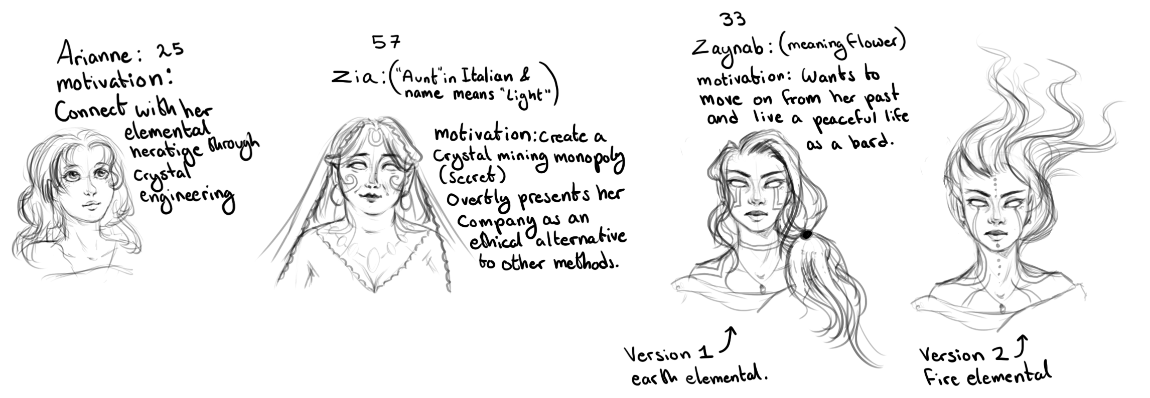 In order to fully inform her visual design, I began with world building; developing the story, character dynamics, and various in-world cultures