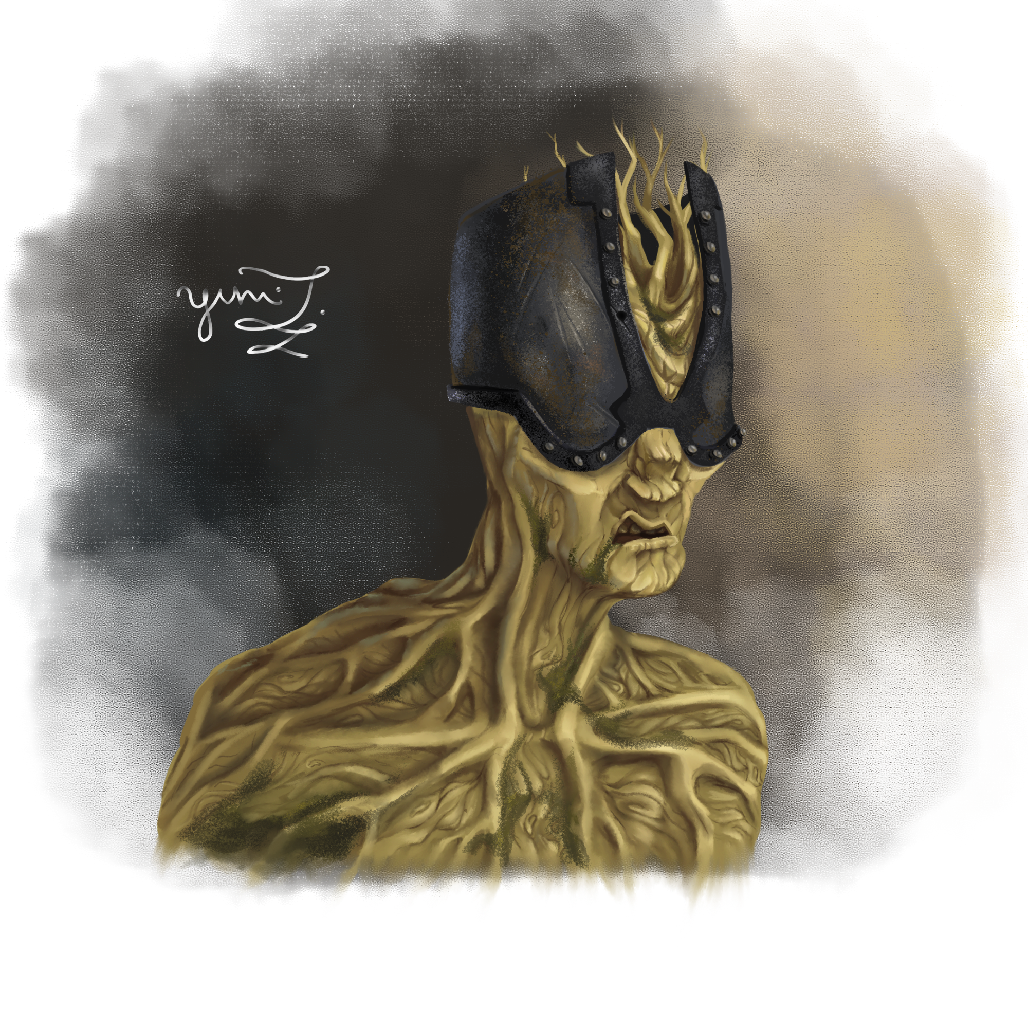 The Emissary is a snarky, rude, and foul old treefolk. I used a wooden texture for his skin, adding moss and rust to emphasize his age and lack of hygiene. A hunched posture and snarky expression help reflect his thorny personality. Leaving his mouth agape mid-sentence helps immerssion, helping the players imagine him speaking through the client’s voice.