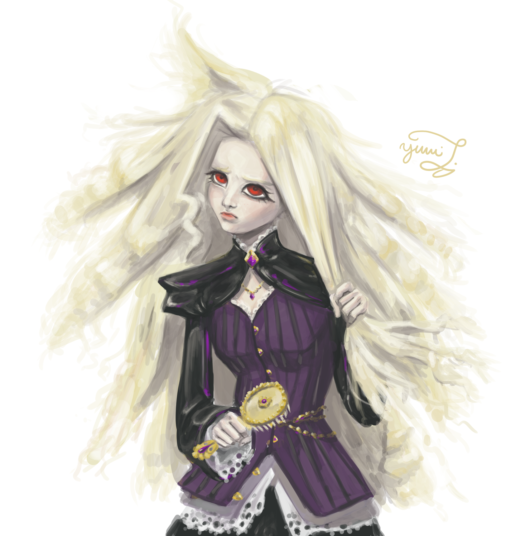 I chose to dress her in clothing typical of the vampire archetype: goth, Victorian, latex etc… but gave her 4C hair she’s clearly trying to straighten out. This serves as a metaphor for her failed attempts to fit in, reflecting a character who hasn’t yet learned to embrace herself. The stark white-platinum hair and bright red eyes, contrasted with a subdued black and purple outfit, reinforce the feeling that she’s wearing a costume rather than something authentic.